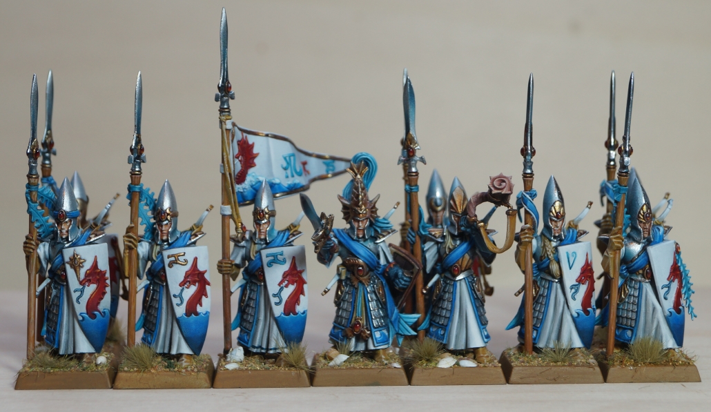 Der erste Schwung der Seegarde wäre fertig. Bei den Kantenakzenten probierte ich den Molotow Liquid Chrome Marker aus. Der Chromglanzeffekt ist unschlagbar. Leider ist der Farbfluss aus dem Stift schlecht kontrollierbar und bei dem Versuch das Zeug mit dem Pinsel aufzutragen, verlor es seinen Glanz. Ich werde da wohl mit der Airbrushpistole experimentieren müssen. Wobei das 30ml Fläschchen stolze 25 Euronen kostet! Hoppla... auf dem Bild fällt mir auf, dass ich den Edelstein auf dem Schwert vergessen hab....hmmpf ;) Auf den Bases fand ich endlich einmal Verwendung für die Minimuscheln, die ich einmal im Urlaub aus dem Sand gesiebt habe, während normale Menschen im Meer baden gingen... Ihr kennt vielleicht die Krankheit, wenn man irgenwann alles auf seine Tauglichkeit als Basingmaterial überprüft :))