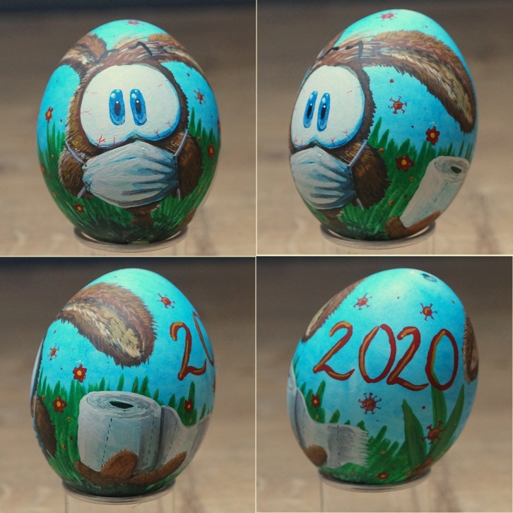 Mein diesjähriger Osterhase trägt situationsbedingt einen Mundschutz, während ihn die Coronaviren umschwirren. In der Hand präsentiert er stolz eine Rolle Klopapier. Die Leute schwören ja drauf. Im Klopapier scheinen offenbar einige Antworten für den Kampf gegen die Pandemie zu liegen. Leider konnte noch niemand diese Antworten entschlüsseln...
