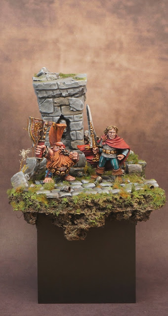 Zunächst wollte ich die beiden lediglich auf ihren Spielbases lassen. Dann dachte ich aber, dass die beiden einen würdigeren Hintergrund bräuchten und habe sie auf ein Showbase integriert. Ich halte mir immer gern die Option offen, die Figuren auch noch in eine Warhammerschlacht führen zu können. Wenn die Figuren also herausnehmbar bleiben sollen, stellt sich mir immer das Problem, wie ich die Spalten zwischen Spielbase und Diorama verdecke. Das gelingt mir leider nicht immer hundertprozentig ;)